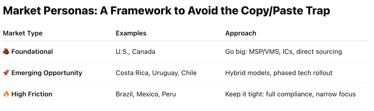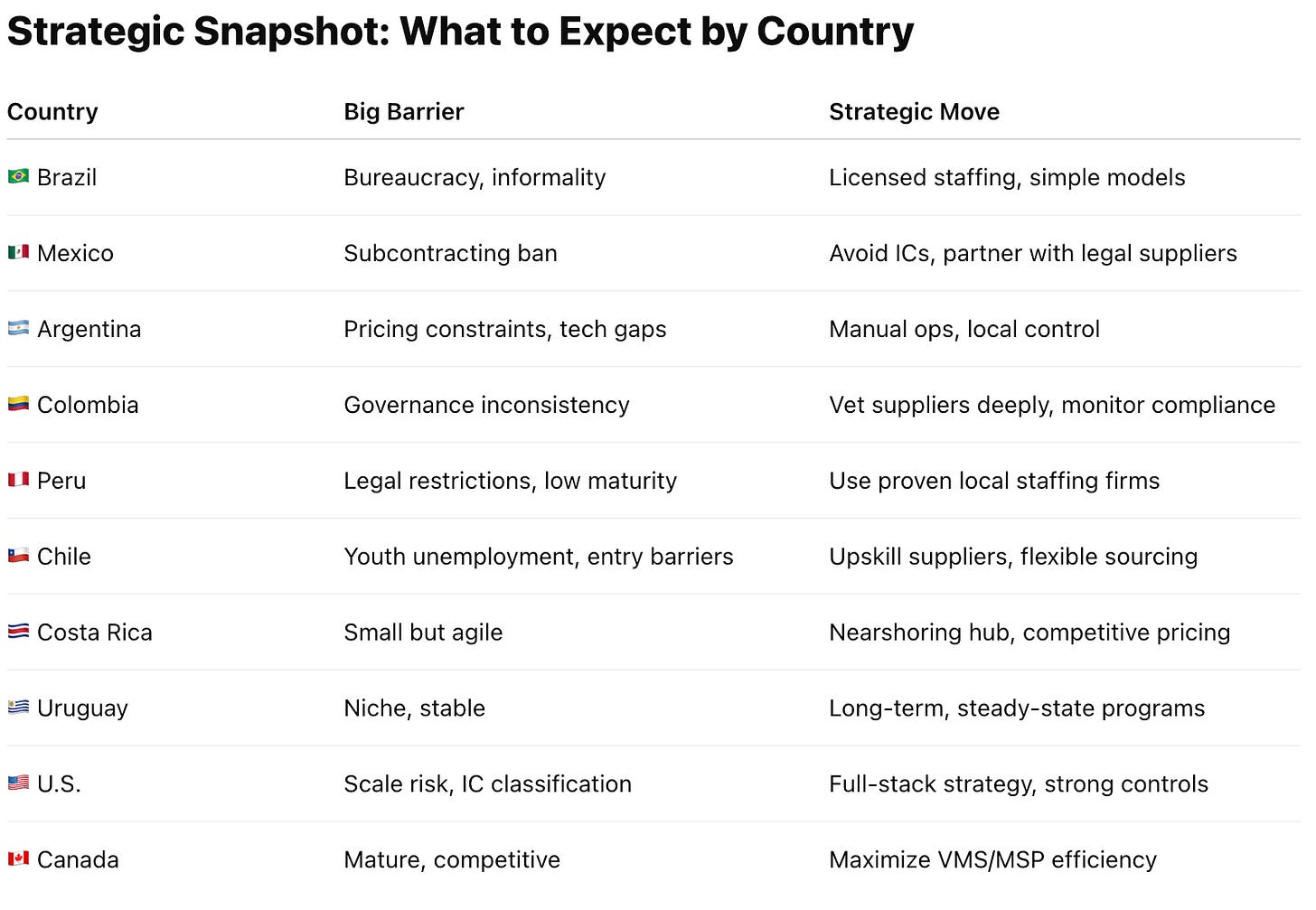 The latest 2025 reports on contingent labor complexity in the Americas confirms what many of us have experienced firsthand — building a contingent workforce strategy is a completely different beast in Brazil than it is in Boston. The variables? They’re everywhere: regulatory environments, labor laws, staffing market maturity, MSP/VMS coverage, tech infrastructure, even how easy it is to fire someone (or not). 🧾⚖️